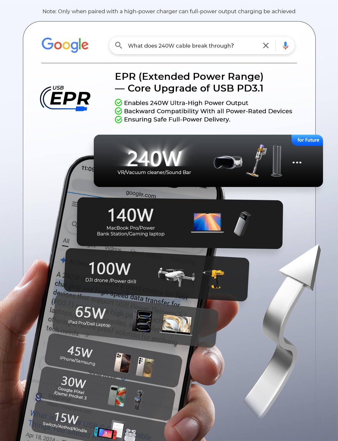 - [High Power ≠ High Risk | Smarter Compatibility for Every Device]: 240W doesn’t mean compromising safety—it means unmatched versatility. Thanks to PD3.1 Extended Power Range (EPR) technology, our iPhone 17 type c charger fast charging cable dynamically adjusts voltage/current to deliver each device’s maximum safe power (e.g., 60W to iPads, 100W to older MacBooks, 140W to MacBook Pro M4). Other 60W/100W c to c cable fast charging can’t hit full charging speed for your power-hungry devices—they’re held back by their own power limits. LISEN 240W usb-c charge cable? It charges all your gear steadily, efficiently, and at full speed, with zero safety risks