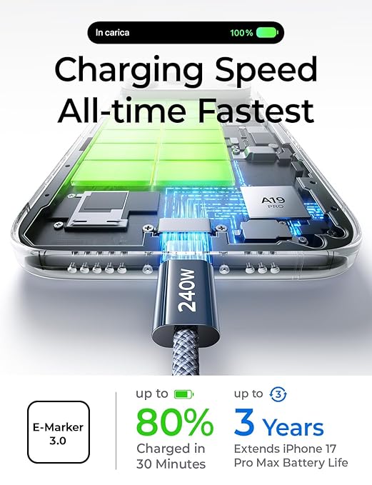 - [240W Ultra Fast Charging | Smart Protocol Matching] This iphone 17 charger cord upports PD3.1 EPR/QC4.0 fast charging up to 240W Max, working seamlessly with USB-C Power Delivery adapters (e.g.60W/100W/240W). It automatically matches your device’s handshake protocol to deliver the maximum safe power it can handle—no guesswork, just the fastest possible charge for each gear. It’s 4X faster than 60W usb c cables: Up to 80% charged in 30 minutes for iPhone 17 Pro Max, Up to 65% charged in 30 minutes for iPad Pro M5, and up to 80% charged in 30 minute for MacBook Pro M5. This c charger cord balances speed and protection perfectly, giving you both fast and secure charging
